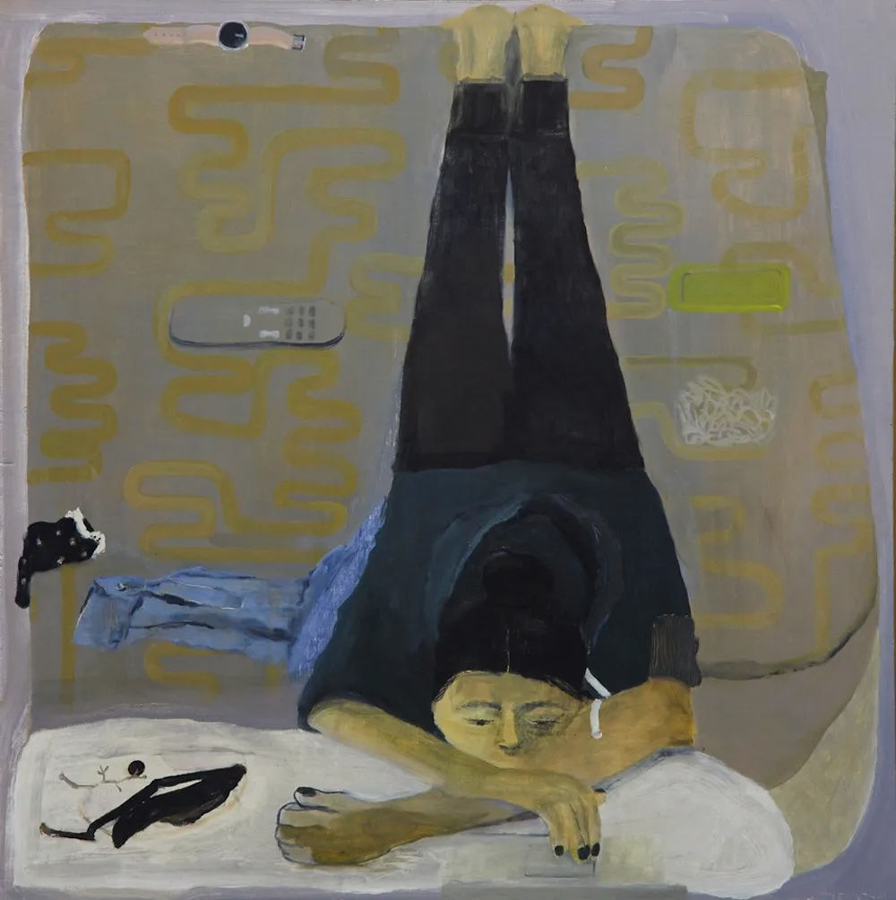 In the square “Bed (April)” (2020), Levinthal tilts the bed up until it is nearly parallel with the picture plane. A black-haired woman in a dark shirt and pants is lying on her stomach, her feet at the top of the painting and her head at the bottom, resting on her folded arms. She is staring at an open laptop.